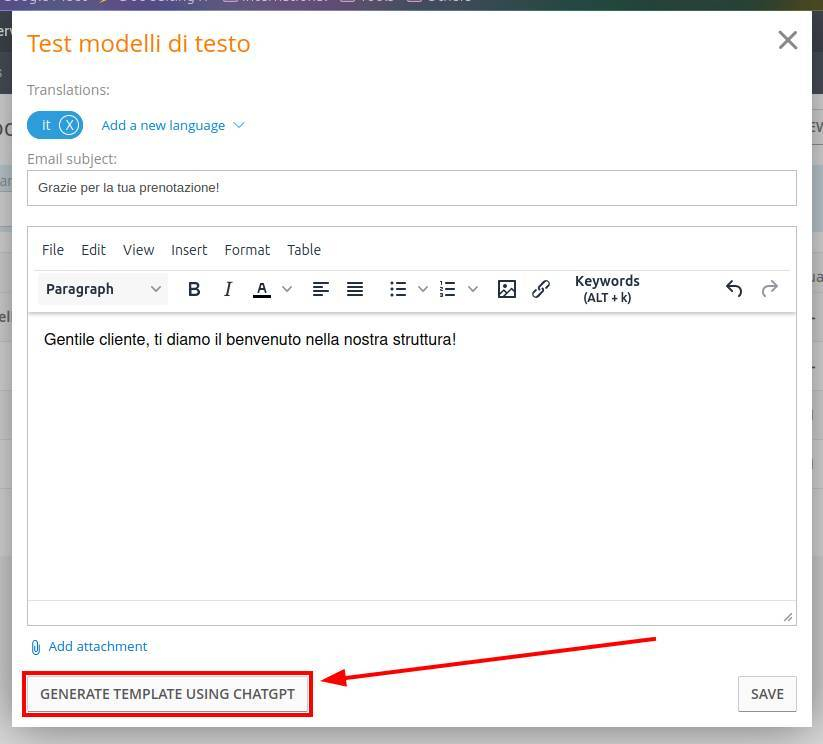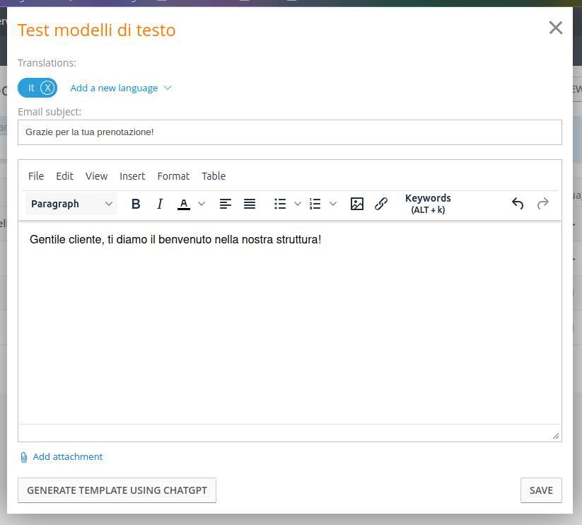 On this page you can create, also with the help of ChatGPT's artificial intelligence, text templates to be used in some sections of Zak or for automatic and manual sending of emails to your guests.