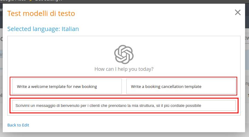 Clicking on the button in the lower left corner of the text editor will open a window where you can ask the AI to generate a text model, either based on predefined prompts (chosen according to the message module you choose), or by asking via a direct and more detailed prompt, then pressing "Enter" on the keyboard.