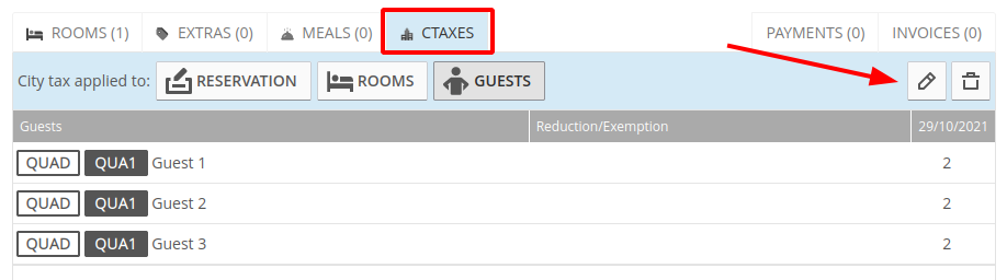 Se você precisar inserir uma isenção ou redução manualmente, clique em HÓSPEDES e depois no lápis. Em seguida, escolha a isenção/redução para os hóspedes que você deseja: