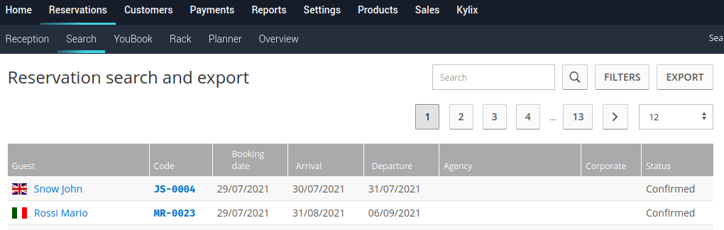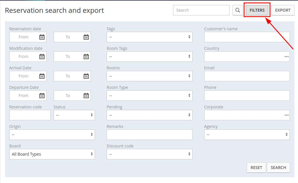 - the FILTERS button, to filter your search by setting certain parameters such as period, agency/corporate, country, reservation status, board, etc.: