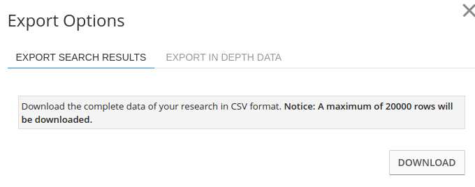 - the EXPORT button, to export the data in a csv file, choosing whether to export the results of the search just performed or the advanced data:
