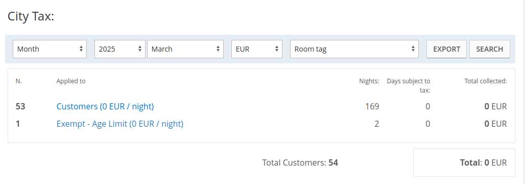 - Ночи: количество ночей, проведенных этими клиентами (сумма ночей, проведенных каждым гостем). - Оплаченные дни: среди вышеуказанных ночей, сколько подлежат налогообложению. Не все ночи обязательно должны быть облагаемы налогом, если ваша муниципалитет устанавливает налог только за первые X дней. - Всего собрано: общая сумма налога с этих гостей